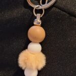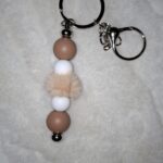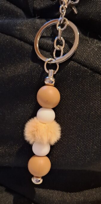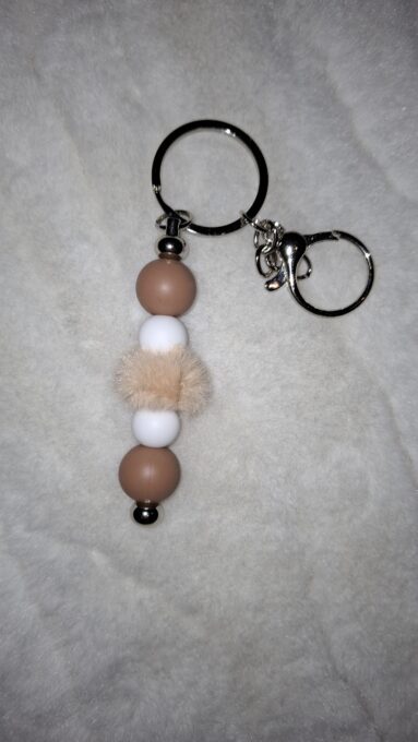 Je to krásna kľúčenka z hnedých a bielych silikónových korálikov.Dá sa na hocičo pripnúť napríklad:ruksak,kabelka,kľúče…