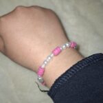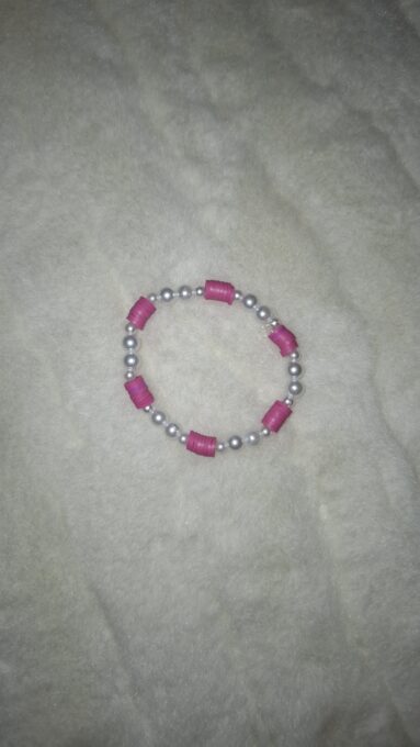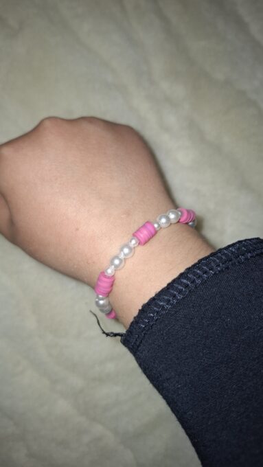 Je to krásny náramok z bielych perličiek a okrúhlych rúžovych korálikov.Je vhodný najmä pre deti.
