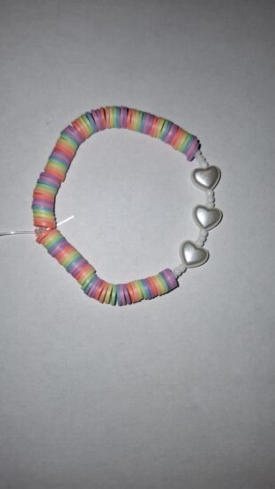Je to krásny farebný náramok z okrúhlych korálok a troch bielych srdiečok.Je vhodný najmä pre ženy a deti.