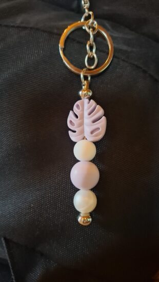 Je to krásna kľúčenka z fialových a bielych silikónových korálok.Dá sa na hocičo pripnúť napríklad: ruksak,kabelka,kľúče...