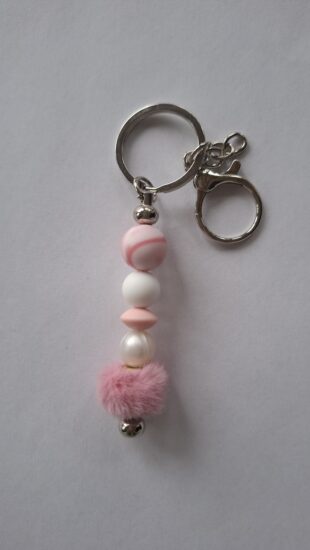 Je to krásna kľúčenka z rúžových a bielych silikónových korálok.Dá sa na hocičo pripnúť napríklad:ruksak,kabelka,kľúče...